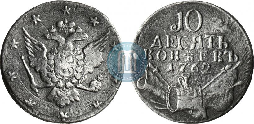 10 kopecks 1762 year . "КОПЪЕКЪ". Copper. Edge netlike. Bitkin # 14 (R), Petrov - 1-1,25 rub., Ilyin - 2 rub., Conros # 173/1 173/2 173/3 173/4 173/5