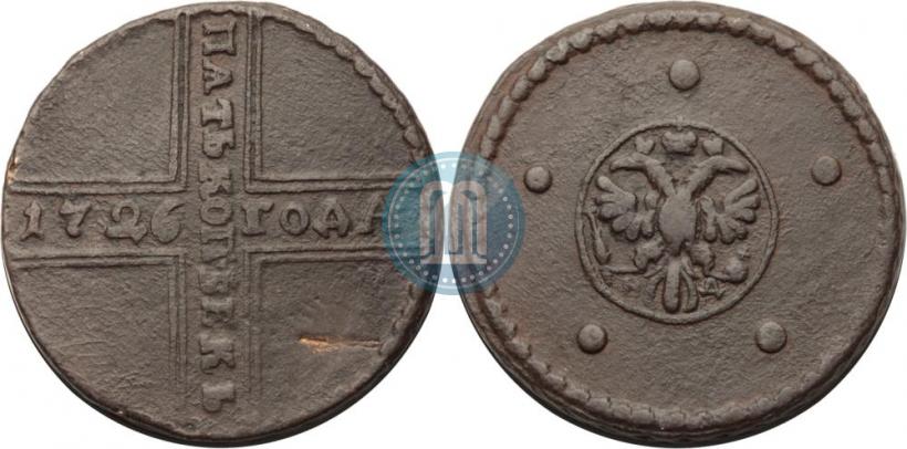 5 kopecks 1726 year НД . Date upwards. Copper. Edge netlike.