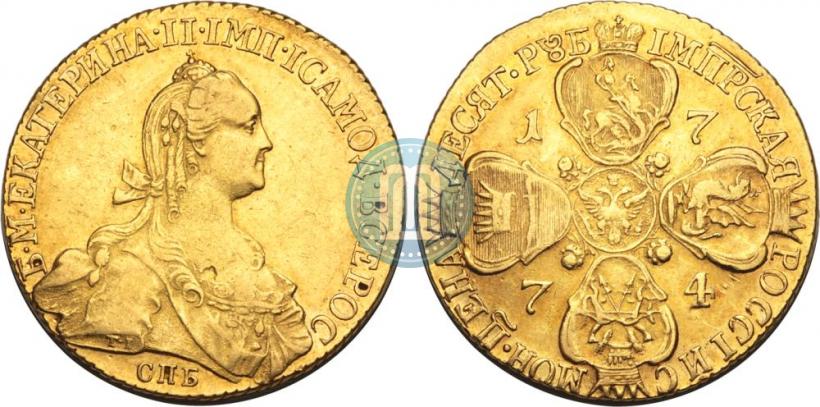 10 roubles 1774 year СПБ . Gold. Edge cordlike leftwards. Bitkin # 29 (R), Petrov - 22 rub., Ilyin - 20 rub., Conros # 4/21