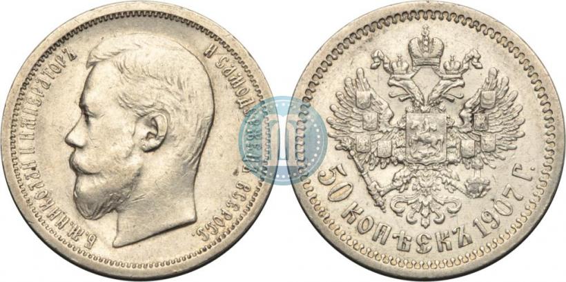 50 kopecks 1907 year (ЭБ) . Silver. Edge inscription. Bitkin # 86 (R), Conros # 121/22