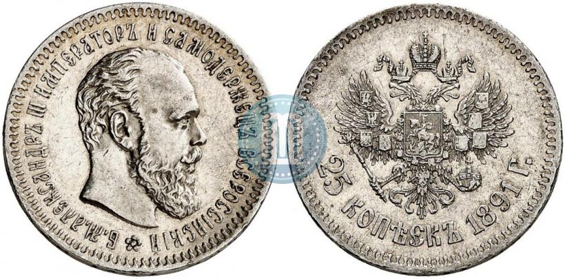 25 kopecks 1891 year (АГ) . Silver. Edge inscription. Bitkin # 94 (R), Conros # 139/6