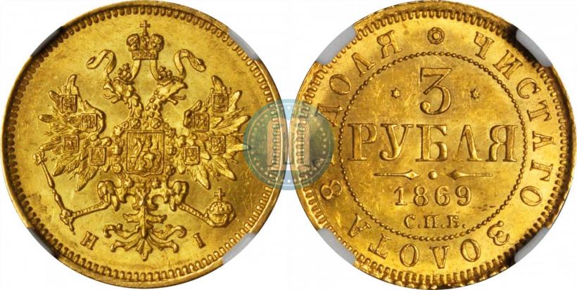 3 roubles 1869 year СПБ-НІ . Gold. Edge dotted. Bitkin # 31 (R), Conros # 21/1
