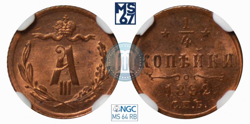 1/4 kopeck 1892 year СПБ . Copper. Edge ribbed. Conros # 243/41