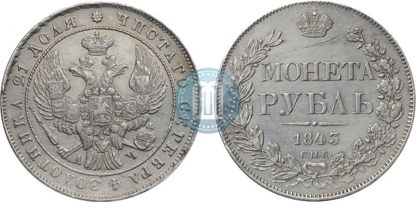 1 rouble 1843 year СПБ-АЧ . Eagle of 1841. Wreath of 8 links. Silver. Edge inscription. Petrov - 1,5 rub., Ilyin - 3 rub., Conros # 79/88 79/89