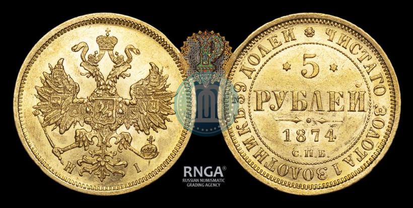 5 roubles 1874 year СПБ-НІ . Gold. Edge dotted. Conros # 18/18