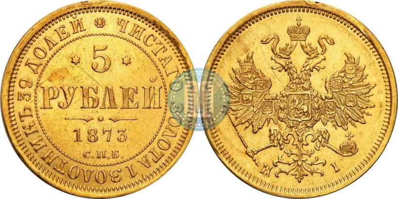 5 roubles 1873 year СПБ-НІ . Gold. Edge dotted. Conros # 18/17