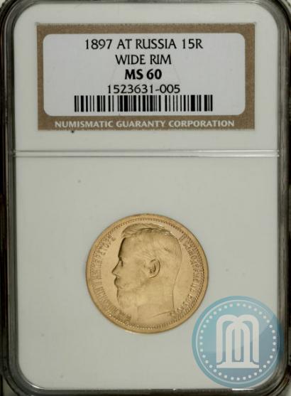 15 roubles 1897 year (АГ) . Two last letters are above the edge of the neck. Gold. Edge inscription. Bitkin # 1 (R), Conros # 1/1
