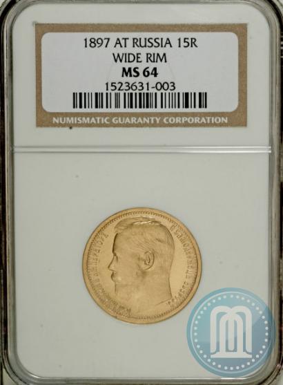 15 roubles 1897 year (АГ) . Two last letters are above the edge of the neck. Gold. Edge inscription. Bitkin # 1 (R), Conros # 1/1