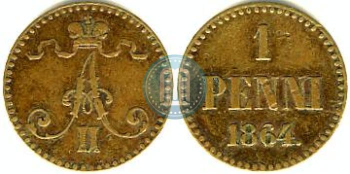 1 penni 1864 year . Copper. Edge plain. Bitkin # 664 (R3), Petrov - 5 rub., Ilyin - 10 rub., Conros # 489/1