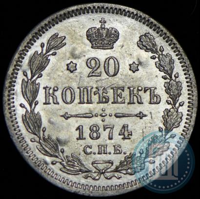 20 kopecks 1874 year СПБ-HI . Silver. Edge ribbed. Conros # 146/53