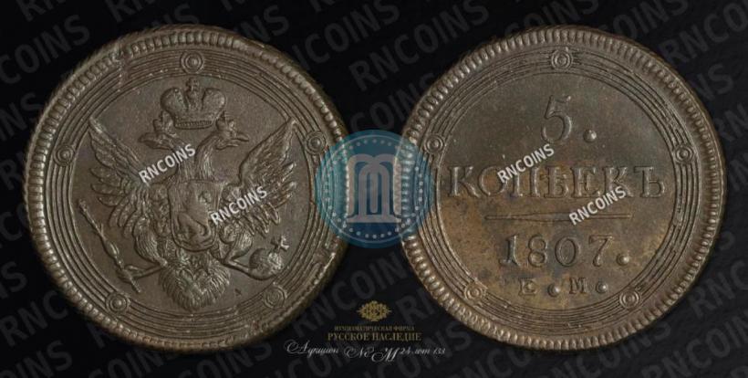 5 kopecks 1807 year ЕМ . Large crown. Copper. Edge cordlike leftwards. Petrov - 0,5 rub., Conros # 182/12