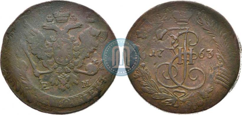 5 kopecks 1763 year ЕМ . Copper. Edge netlike. Conros # 180/1