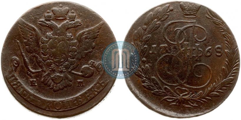 5 kopecks 1768 year ЕМ . Eagle of 1763-1767. Copper. Edge netlike. Conros # 180/8