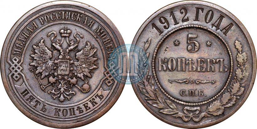 5 kopecks 1912 year СПБ . Copper. Edge ribbed. Conros # 185/23