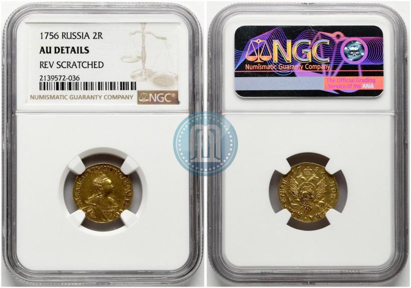 2 roubles 1756 year . Gold. Edge cordlike rightwards. Bitkin # 50 (R), Petrov - 6 rub., Conros # 34/1