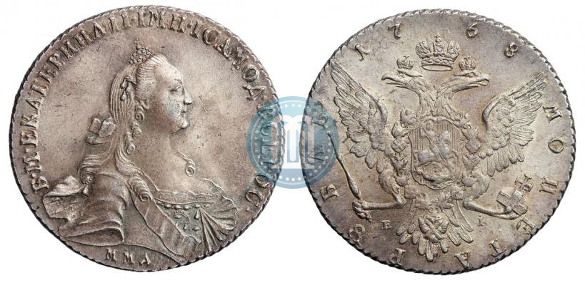 1 rouble 1768 year ММД-EI . Standard portrait. Silver. Edge cordlike leftwards. Petrov - нет rub., Ilyin - 3-5 rub., Conros # 70/29