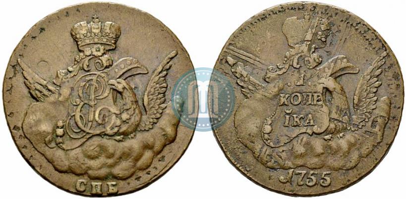 1 kopeck 1755 year СПБ . Copper. Edge netlike. Bitkin # 532 (R), Petrov - 1 rub., Conros # 206/3