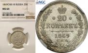 Completed and current offers coin 20 kopecks 1869 year СПБ-HI at numismatic auctions. Silver. Sales are recorded at public numismatic auctions around the world. The sale price is indicated without taking into account the auction commission.